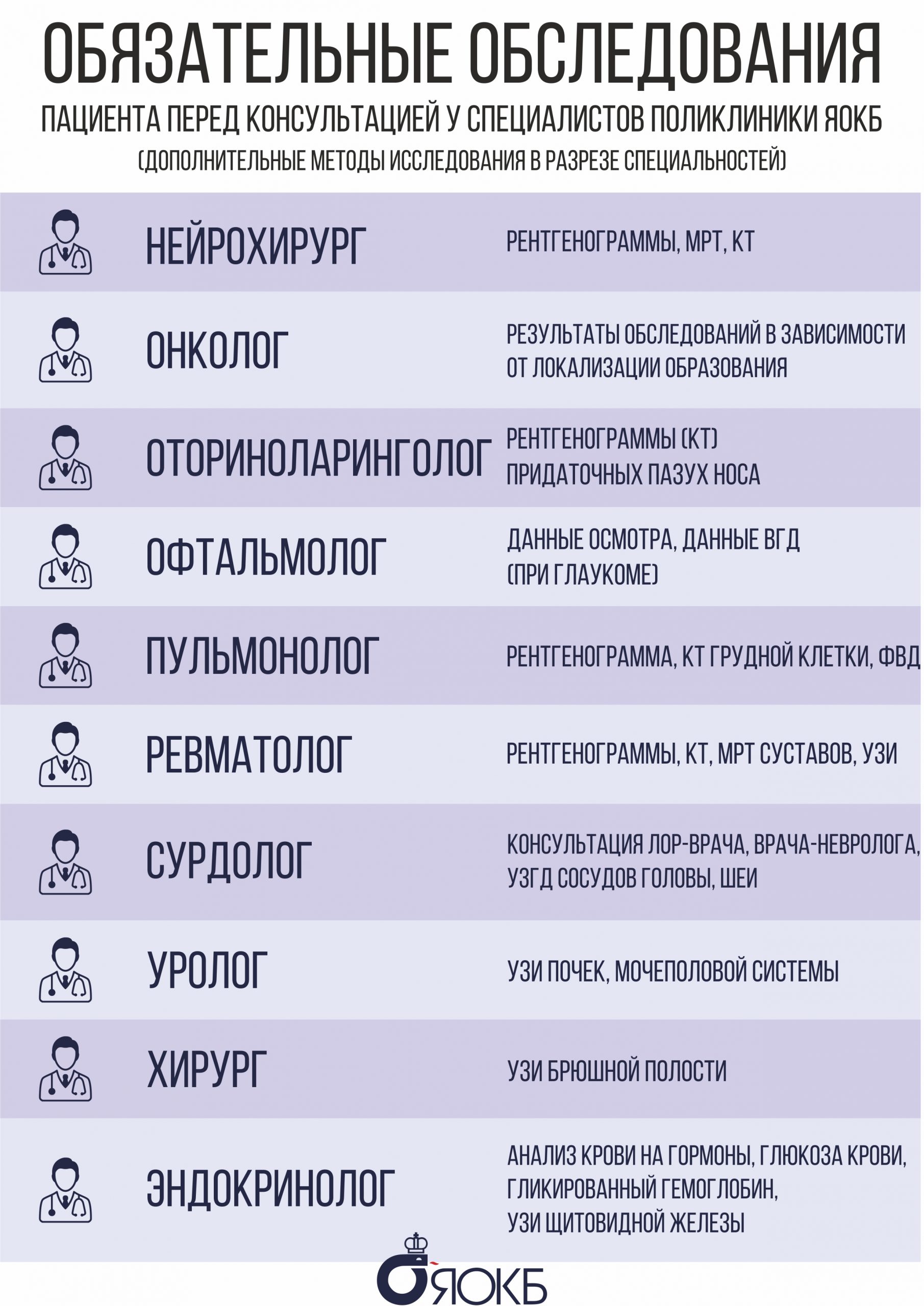 Плановая консультация врача-специалиста поликлиники ЯОКБ проводится при наличии медицинских показаний по направлениям медицинских организаций, с приложением следующих данных: данные лабораторных исследований: клинический анализ крови, биохимический анализ крови, анализ мочи общий, информация о проведенном лечении ранее, данные дополнительных методов исследований. Обязательные обследования пациента перед приемом